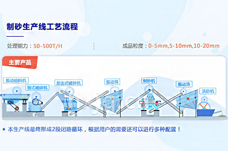 石料由振動給料機送至顎破進行粗碎,粗碎后的物料送至圓錐破或反擊破進行再次破碎,破碎后的石料通過輸送機送進振動篩進行篩分,滿足制砂機進料粒度的石料進入制砂機進行制砂,不滿足要求的返回圓錐破或反擊破重新進行破碎。從制砂機出來的石料,再次進入振動篩內(nèi)進行篩分,篩分出滿足要求的機制砂,進入洗砂機清洗,清洗后由成品輸送帶輸送即為成品;不滿足要求的砂石混合物料,送入制砂機進行再次破碎。